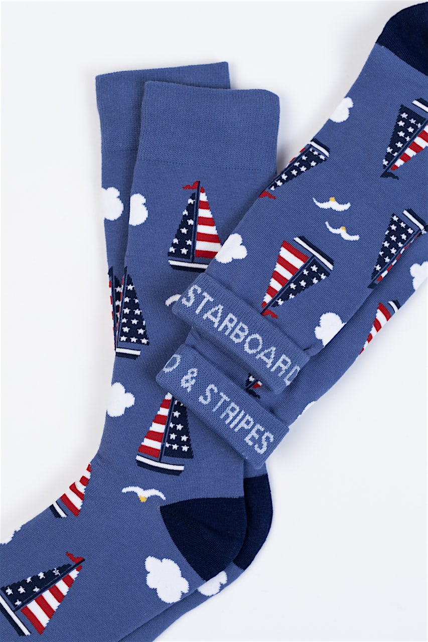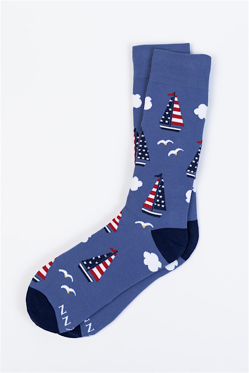 Catch the breeze with Alynn’s “Starboard & Stripes” carded cotton trouser socks, featuring sailboats with American flags on their sails. Soft, breathable, and comfortably snug, they combine nautical flair with patriotic pride—perfect for boating fans, summer outings, or anyone who wants a touch of wind-and-stars style at their ankles.